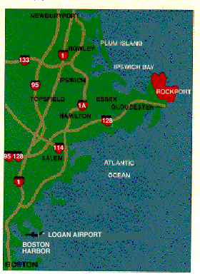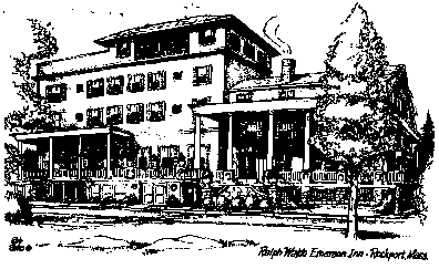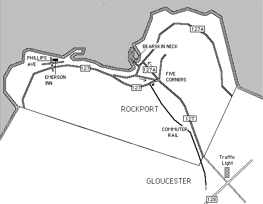 The Ralph Waldo Emerson Inn is in Pigeon Cove, a section of Rockport, on the Massachusetts coastline north of Boston. Rockport can be reached by automobile from Boston by taking Route 93 or Route 1 north to Route 128, and following Route 128 north to the intersection with Route 127 at a traffic light (not a circle) in Gloucester. Go left onto Route 127 and follow it about three miles north to a five-way intersection where 127 goes left and 127A goes right. The Emerson Inn is about two miles farther on 127, just off Phillips Ave. You may also go right onto 127A; this takes you to the Bearskin Neck artist colony. Take a left (off 127A) at the next T intersection and follow the coastline north to rejoin 127 and reach the Inn. There is a map below. The phone number of the Inn is 978-546-6321.